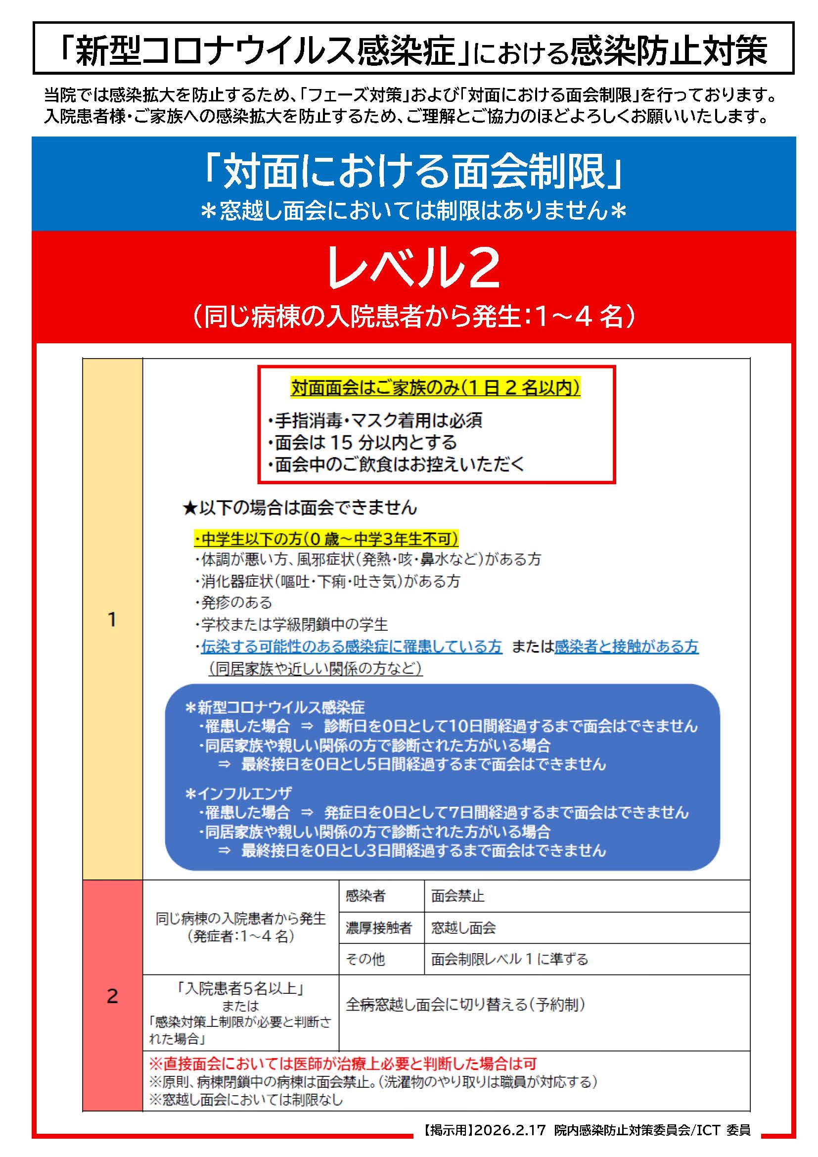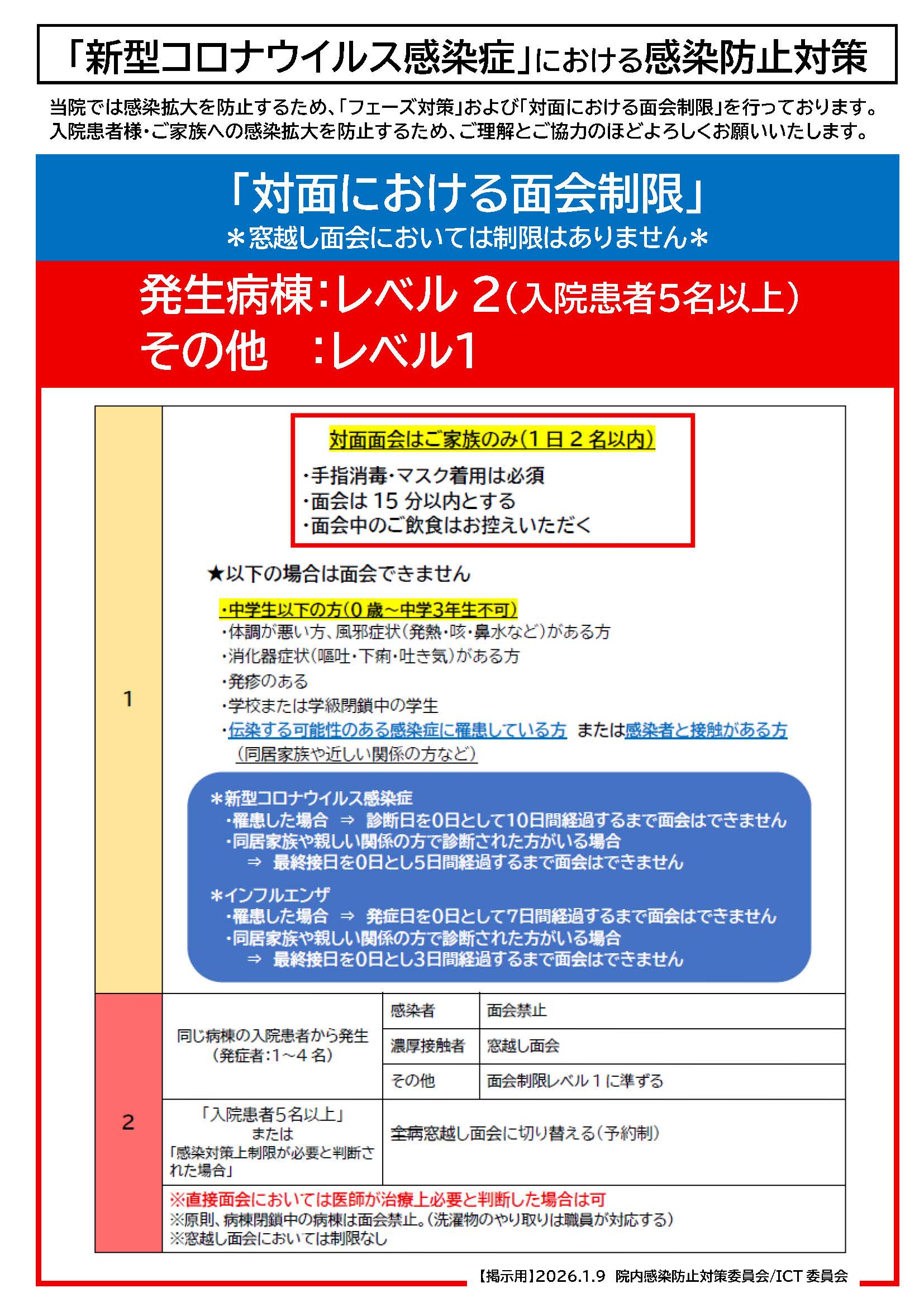 新型コロナウイルス感染症が近隣地区で急速に拡大しているため 令和6年7月23日より面会を一部制限いたします。 なお、窓越し面会については制限しておりません。 ご理解ご協力の程、宜しくお願い申し上げます。