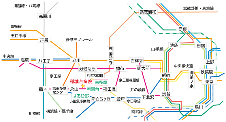 - 稲田堤駅で京王線にお乗り換えになり、若葉台駅から送迎バスをご利用いただくか、南多摩駅からの送迎バスもご利用いただけます。